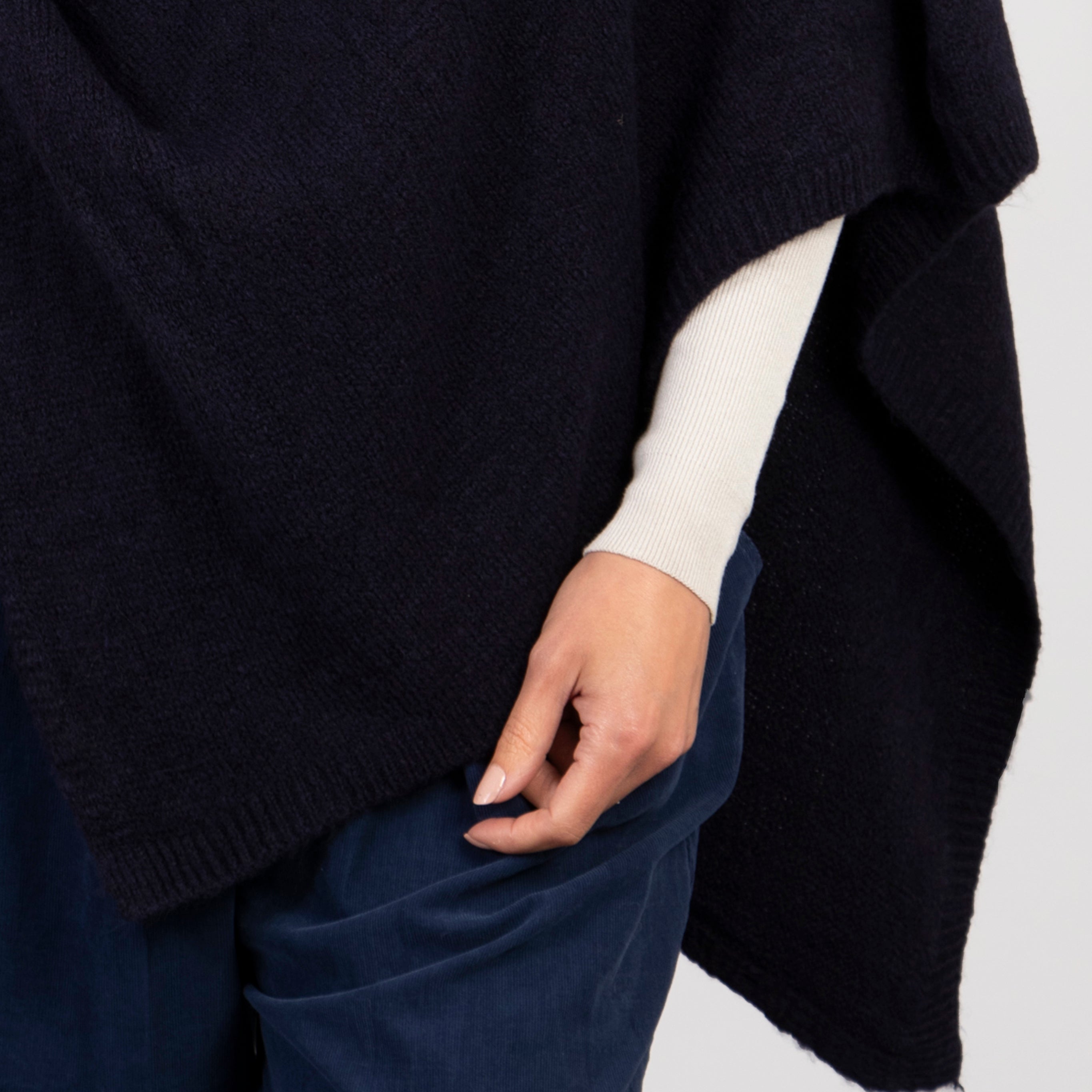 A loose fitting knitted poncho crafted from a soft wool blend yarn. Showcasing a cowl neck and flattering asymmetrical cut.