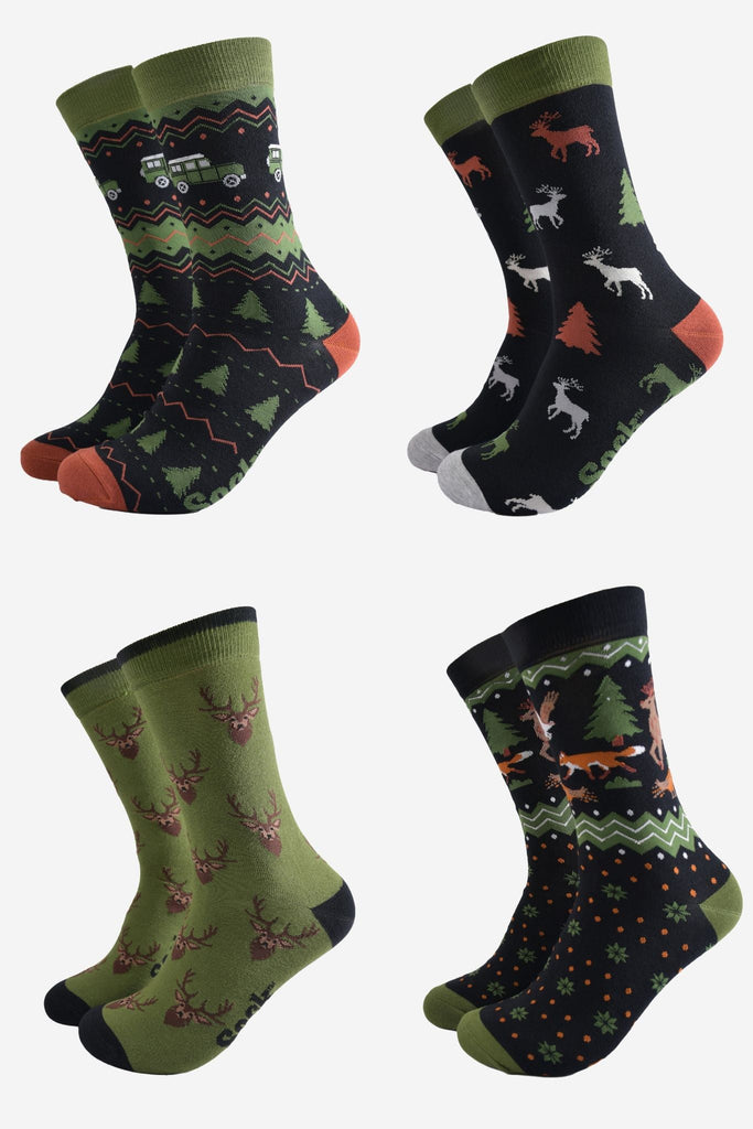 Men's Bamboo Crew Socks Festive Gift Set - Black/Green, Stag & Friends