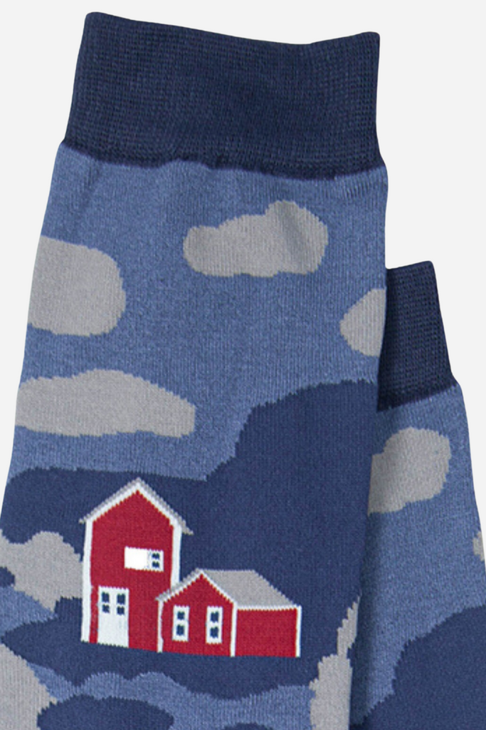 Soft to the touch luxury bamboo socks featuring a coastal sea scape. A scenic creation showcasing a seaside village, red lobsters and fishing boats in a classic blue design, these socks are designed in the UK and crafted from soft eco-friendly bamboo.