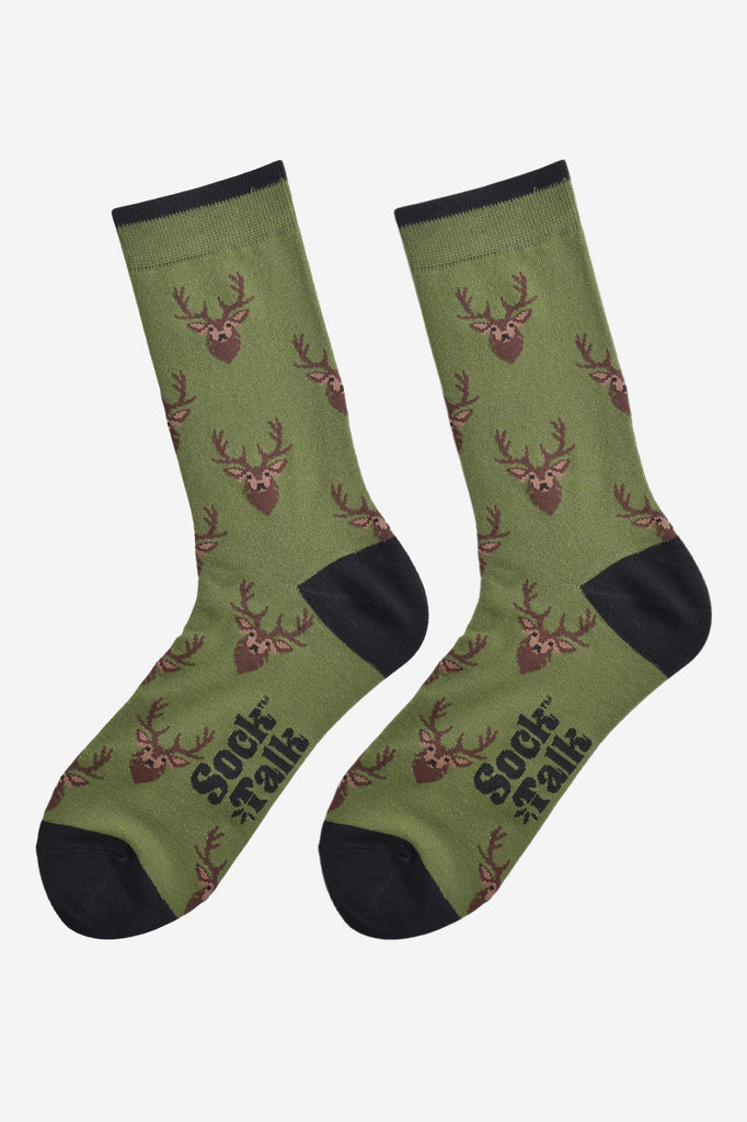 Designed in the UK, these stag socks are crafted from naturally breathable bamboo. Showcasing a stag head pattern these green and black dress socks are eco-conscious and feel luxuriously soft.