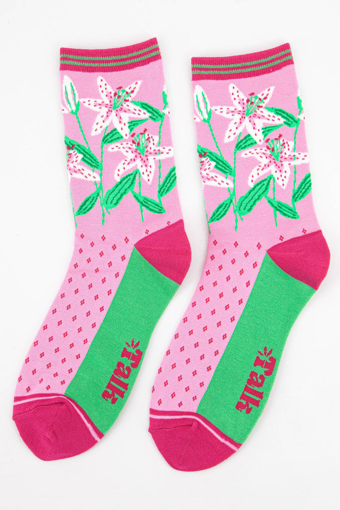 Women's white lily floral bamboo socks with a striped detail cuff.