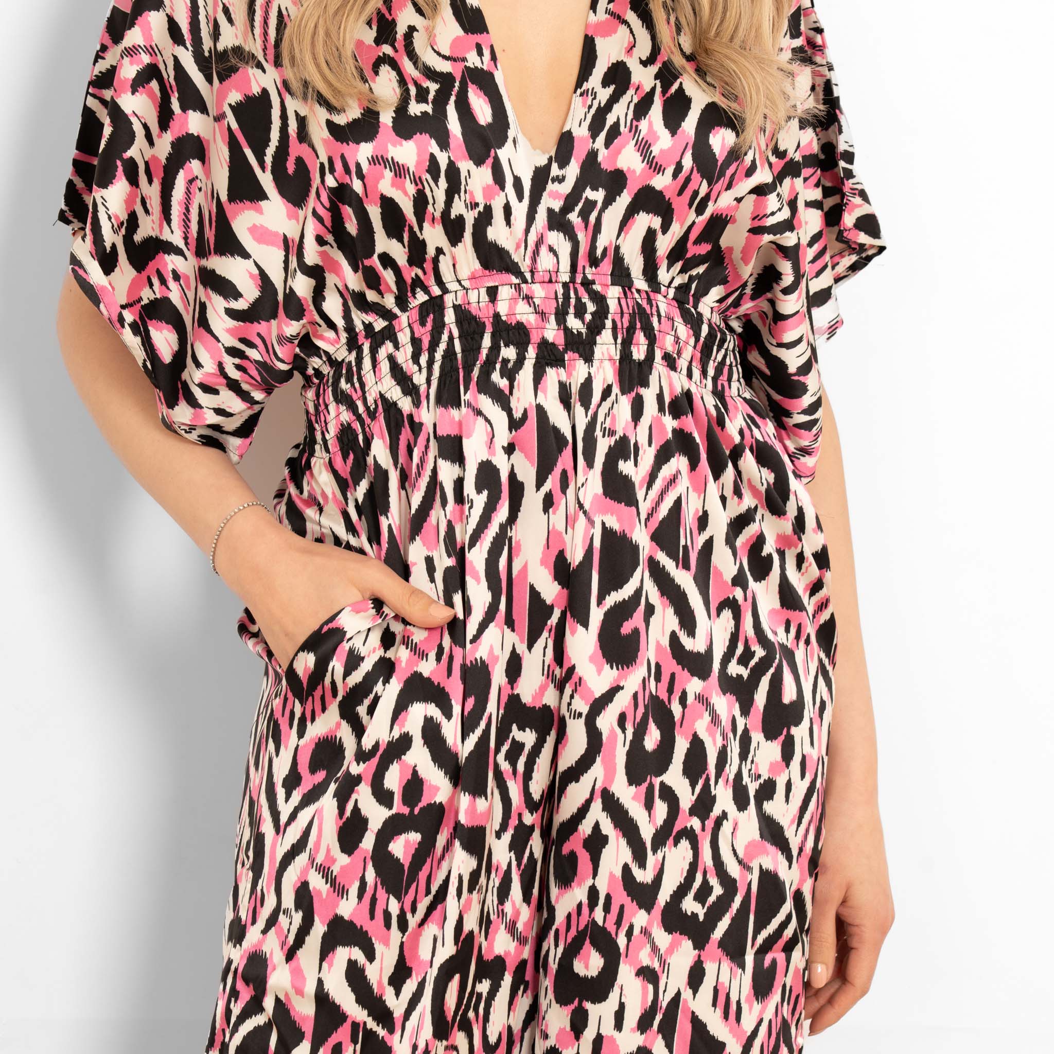 Jilly Deep V-Neck Jumpsuit - Pink, Abstract Ikat