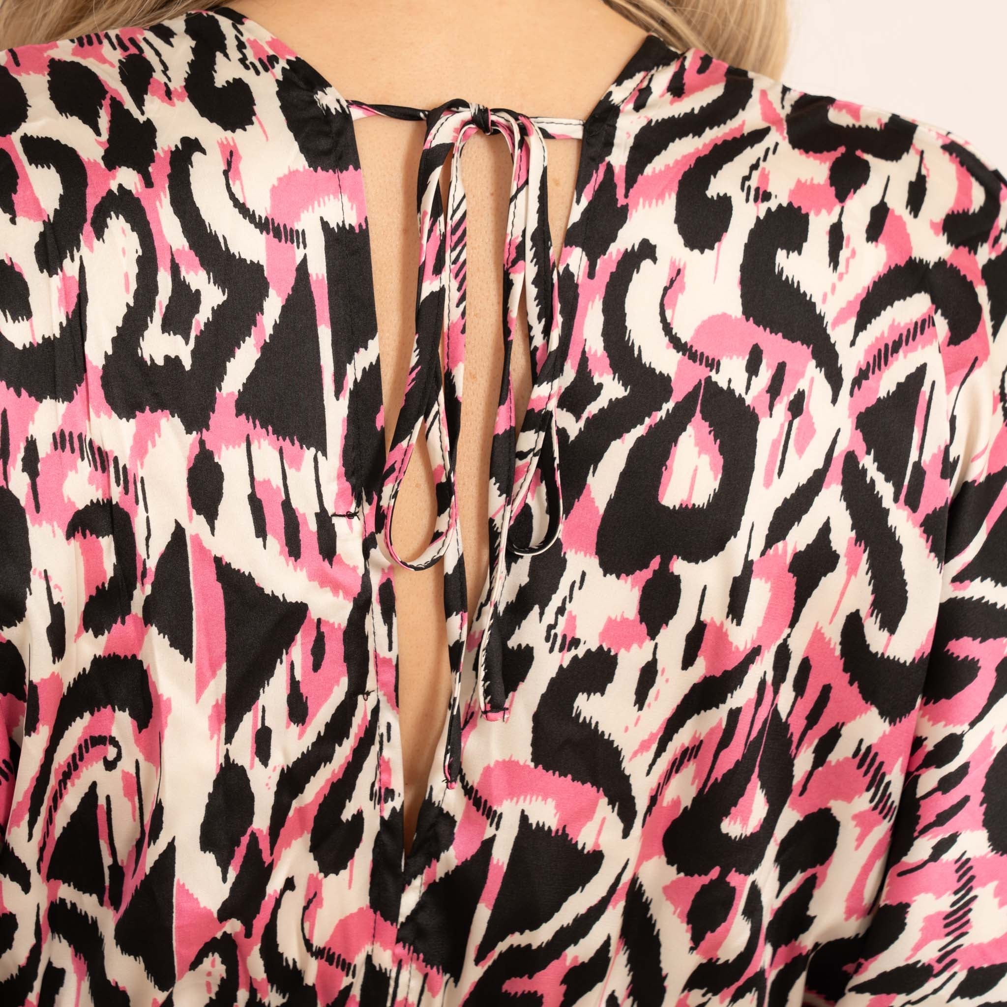 This pink abstract ikat print jumpsuit is bold, colourful and effortlessly chic. Featuring a wide flared leg, plunging v neckline and shirred waistline creating a flattering silhouette.