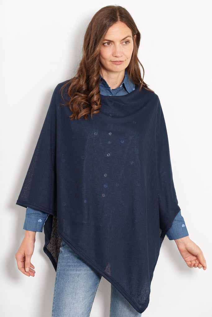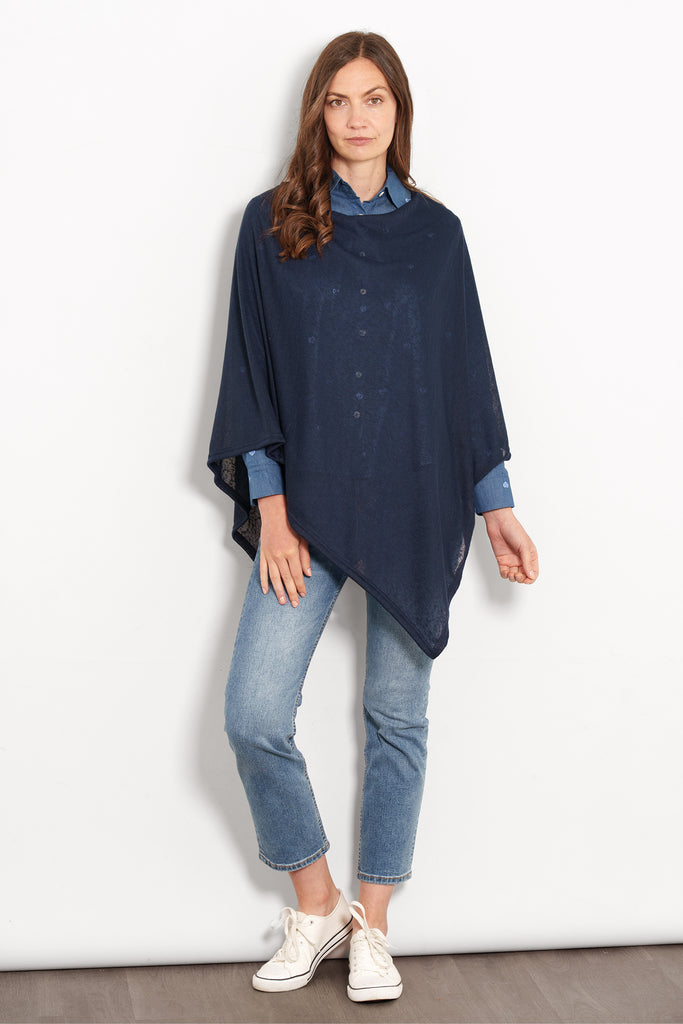 model wearing a plain black lightweight poncho with an asymmetrical hemline and short wide sleeves