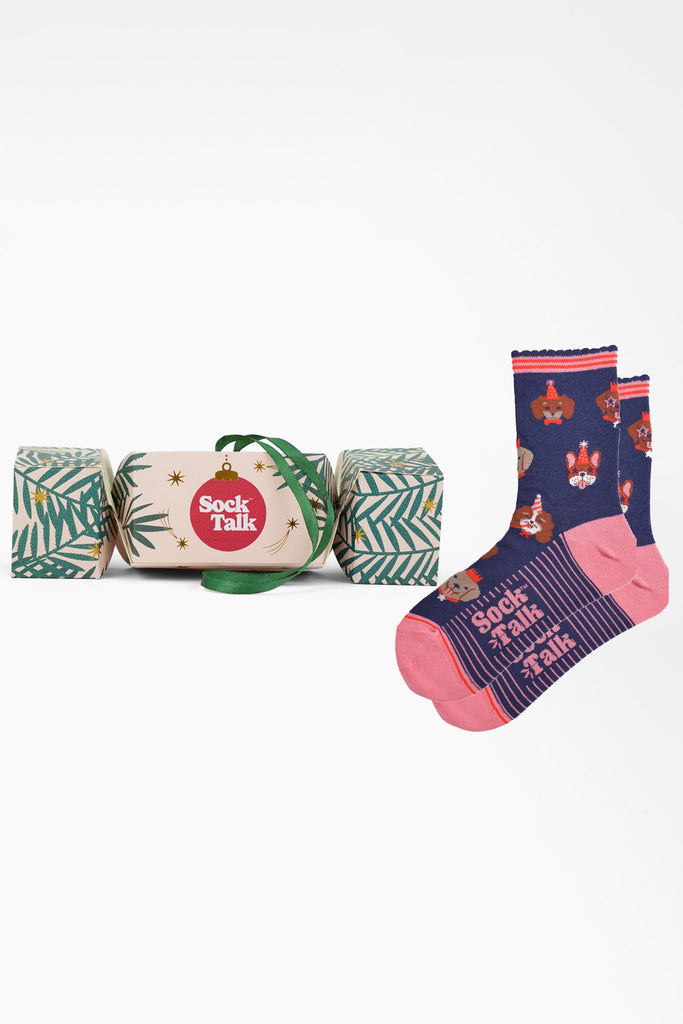 Women's Bamboo Ankle Socks Christmas Cracker Gift Box - Navy Blue/Pink, Party Dogs