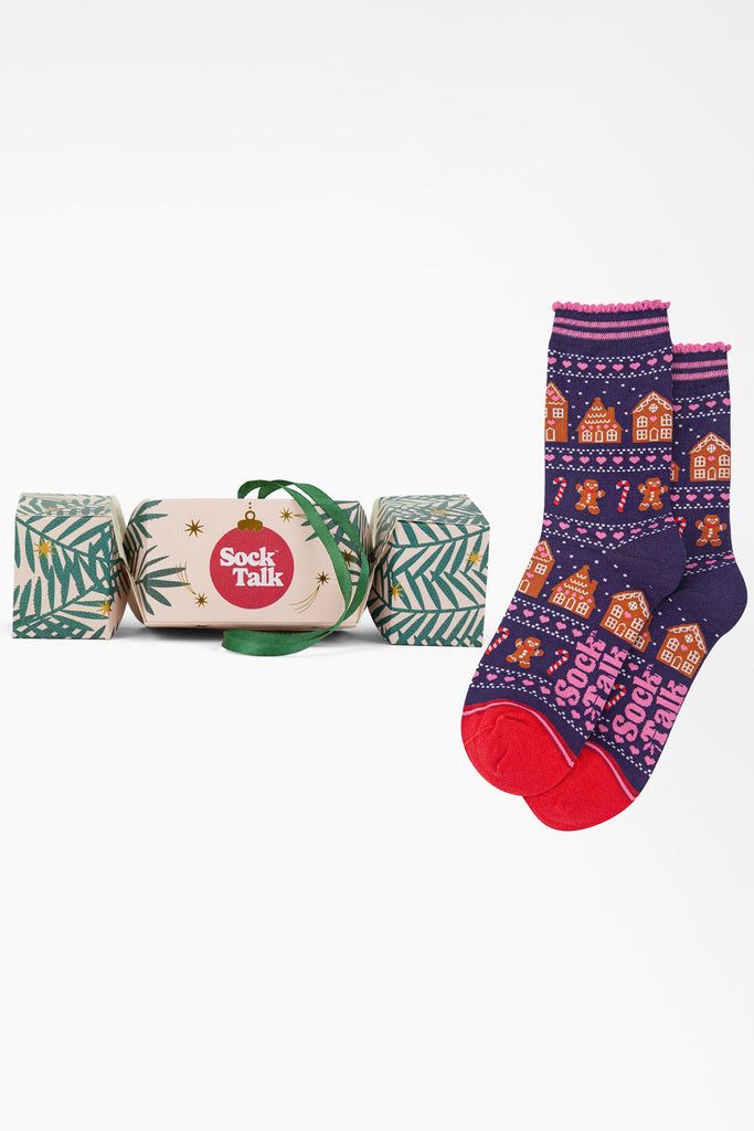 Women's Bamboo Ankle Socks Christmas Cracker Gift Box - Navy Blue/Red, Gingerbread Fair Isle