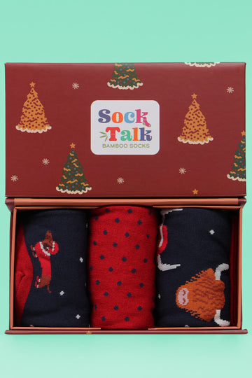 Men's Christmas Animals Bamboo Socks Gift Set. Three xmas novelty dress socks in an artistically designed gift box. Ideal gift for him. UK Size 7-11