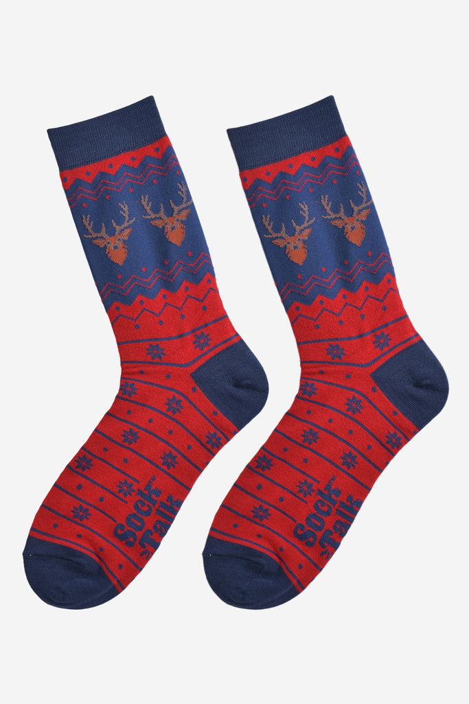 Men's Bamboo Crew Socks Christmas Cracker Gift Box - Red/Navy Blue Stag Fair Isle