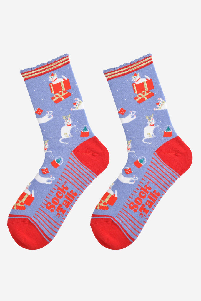 Women's Bamboo Ankle Socks Christmas Cracker Gift Box - Blue/Red, Christmas Cats