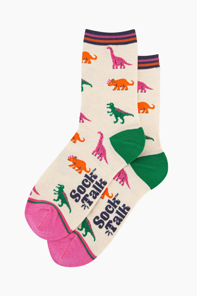 Women's Bamboo Ankle Socks Christmas Cracker Gift Box - Cream/Multi, Dinosaurs