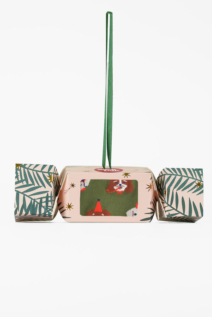 Men's Bamboo Crew Socks Christmas Cracker Gift Box - Green/Navy Blue, Party Dogs