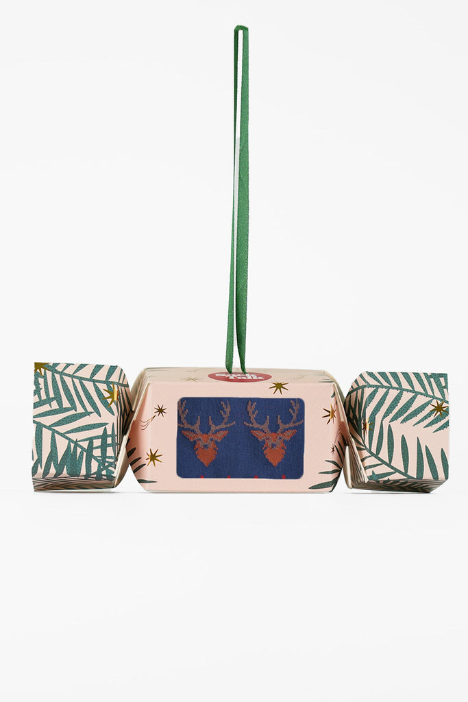 Men's Bamboo Crew Socks Christmas Cracker Gift Box - Red/Navy Blue Stag Fair Isle
