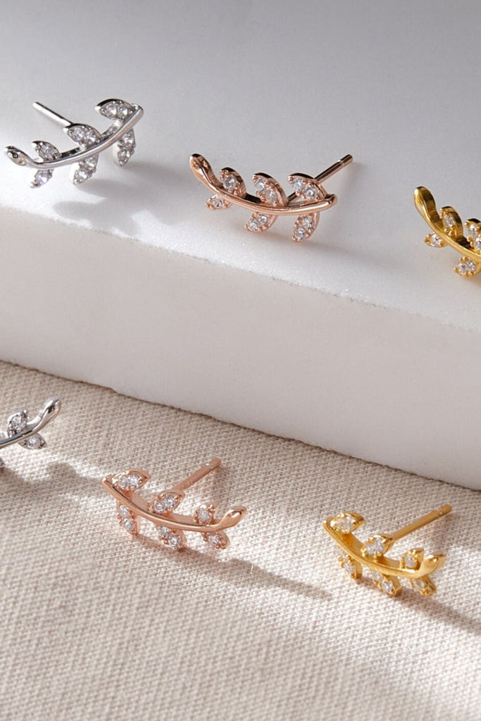 Sterling Silver CZ Sparkly Leaf Stud Earrings