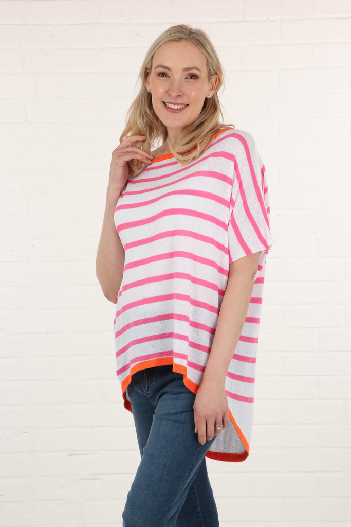 - Striped Short Sleeve Cotton Knitted Top in White, Orange and Fuchsia