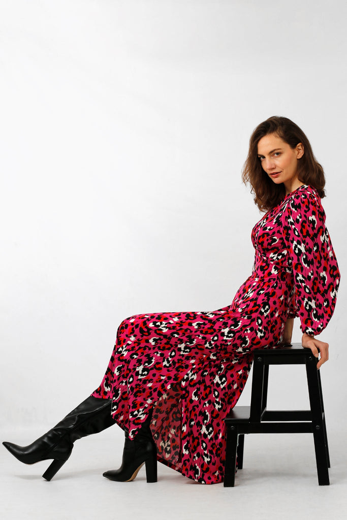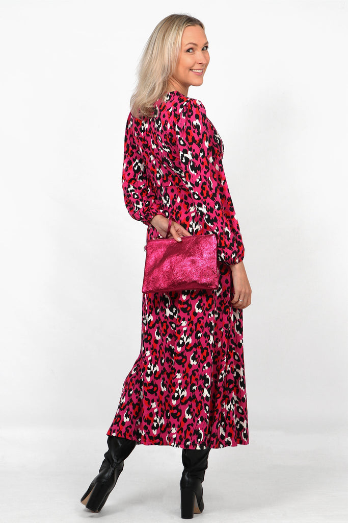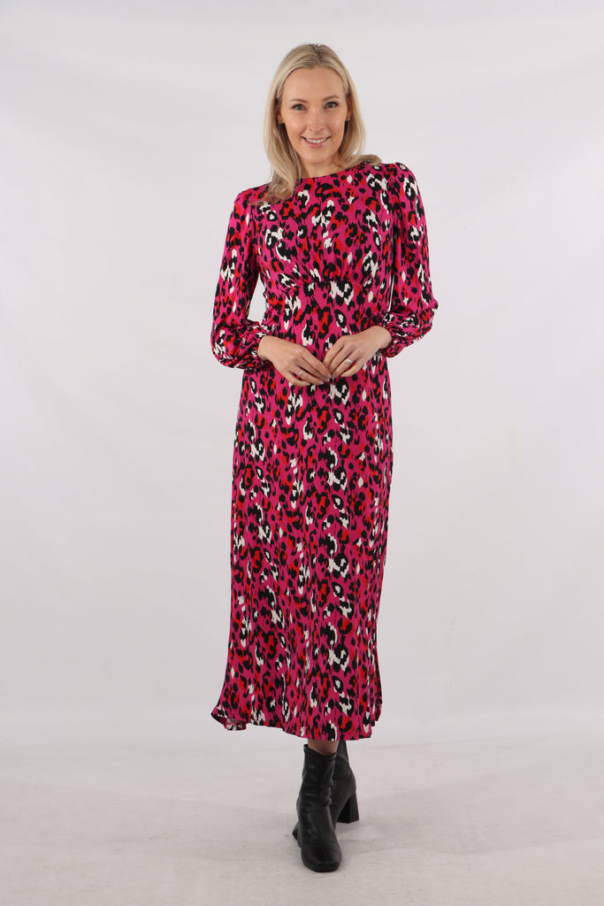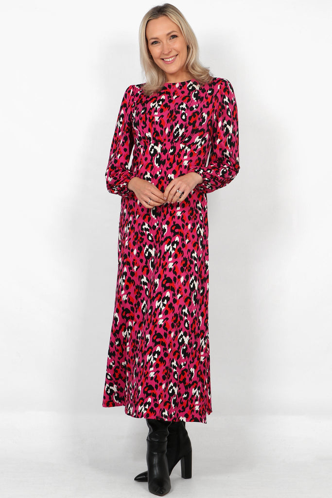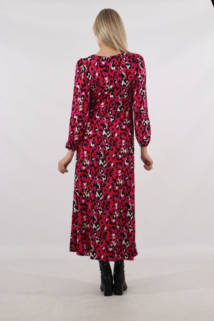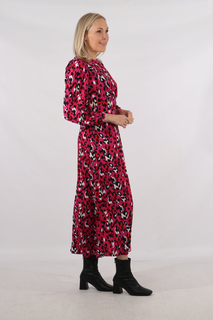 Riley Long Sleeve Midi Tea Dress - Fuchsia, Leopard