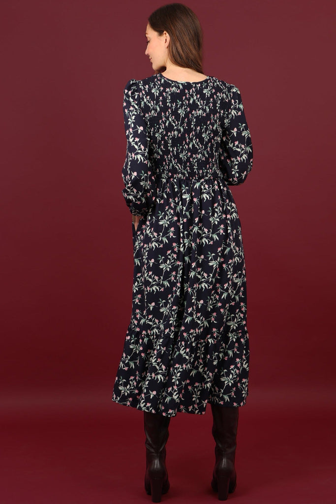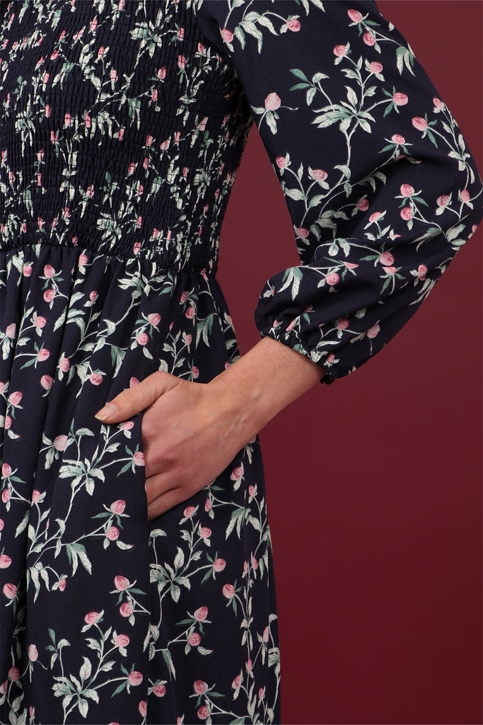 Shirred Bodice Midi Dress - Navy, Floral Buds