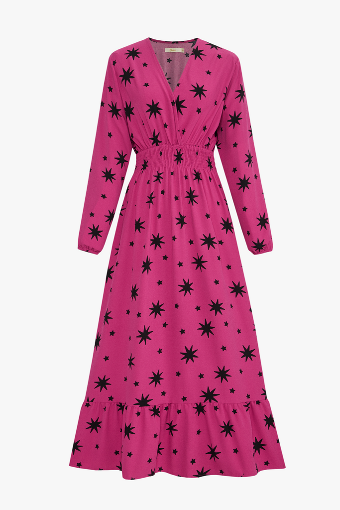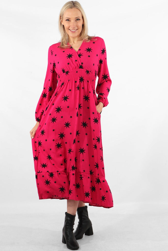 Fuchsia starburst print wrap top maxi dress featuring a shirred waist and modesty button.