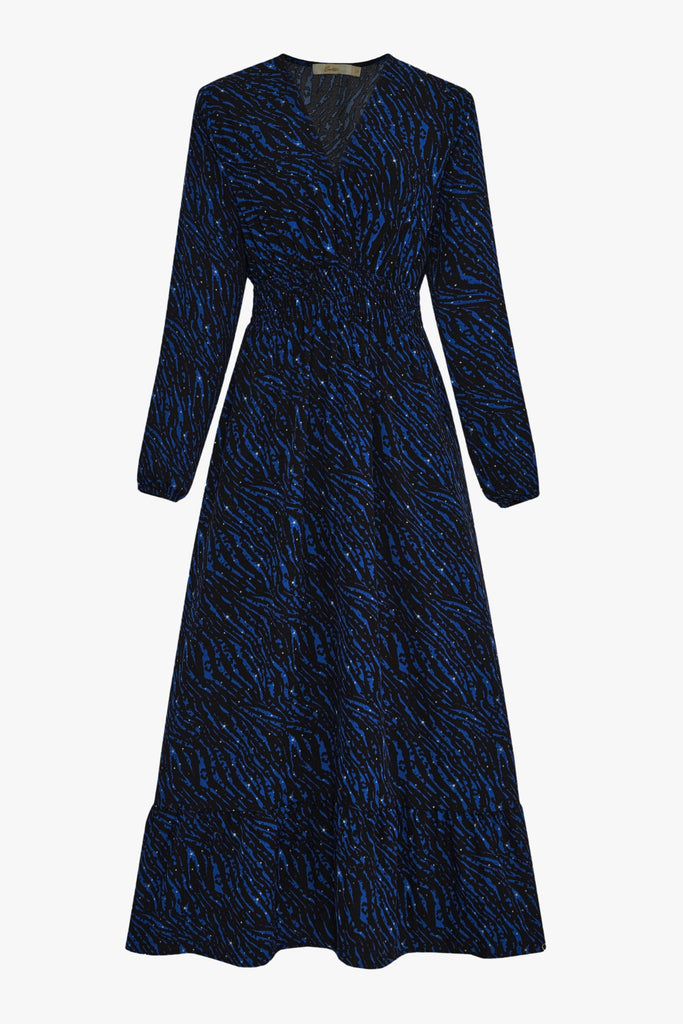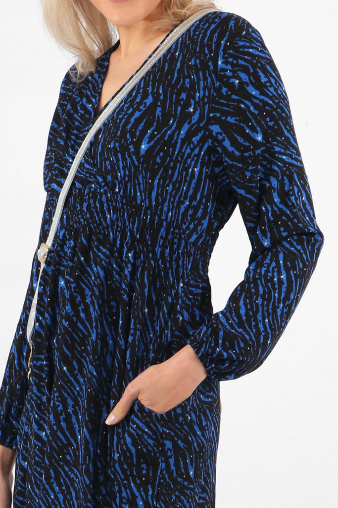 Blue zebra and star print wrap top maxi dress featuring a shirred waist and modesty button.