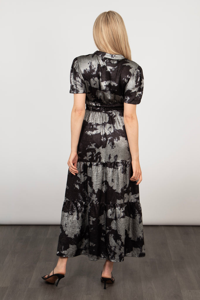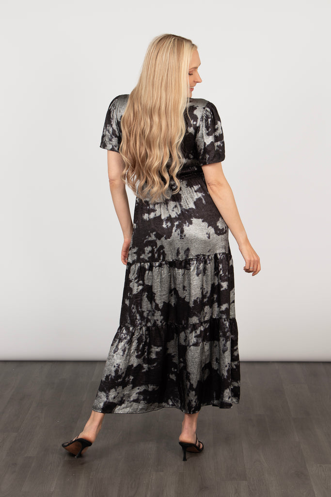 This contemporary maxi dress is crafted from a soft flowing lightweight metallic fabric. Showcasing a paint splash pattern, short sleeves, subtle V-neck and a cinched elasticated waist. This tiered maxi dress is a perfect occasion piece designed to create a flattering silhouette.