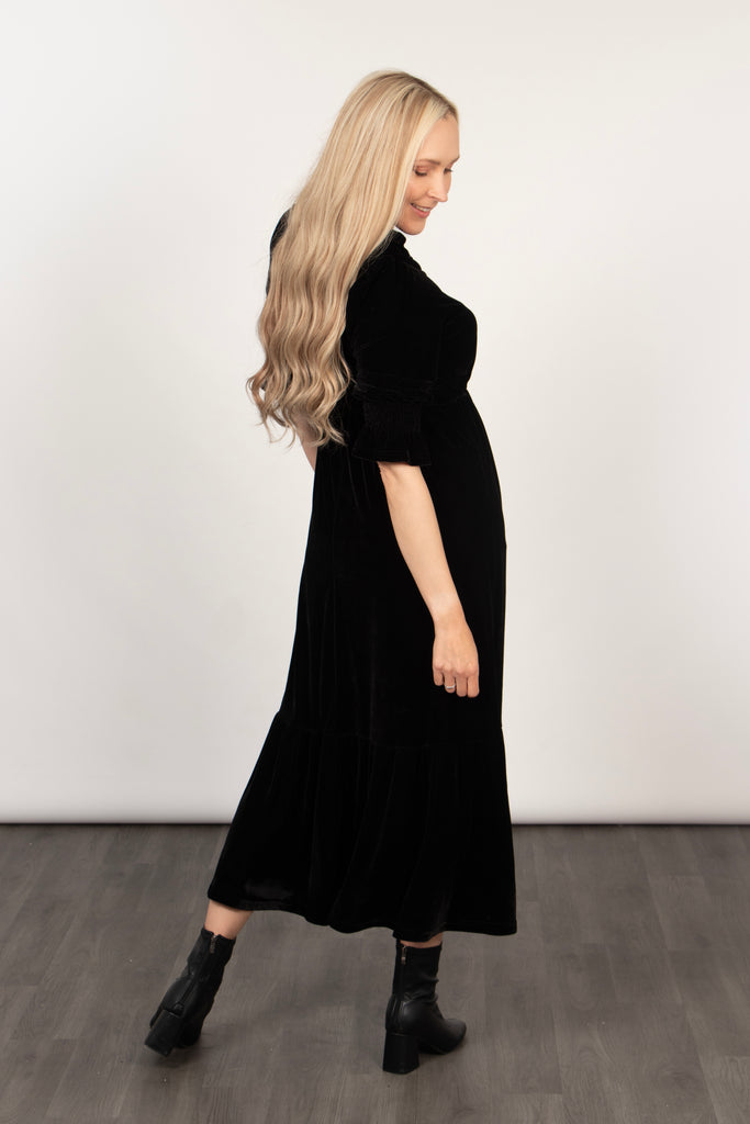 A classic black midaxi dress crafted from soft velvet fabric. Showcasing an open V-neck collar, tiered hem and fluted cropped sleeves. This dress is the perfect occasion piece designed to create a flattering silhouette.