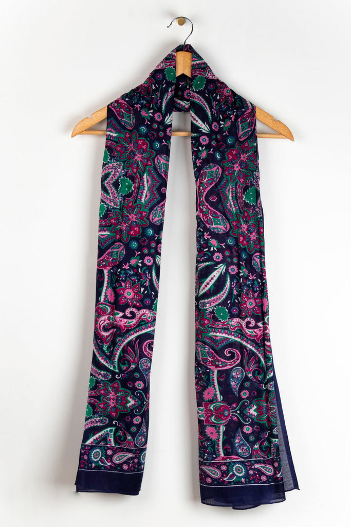 A lightweight scarf crafted from soft viscose. Showcasing a mosaic inspired paisley floral design in bold contrasting navy blue and fuchsia pink hues. A classic accessory, designed for versatility this scarf can be worn multiple ways.