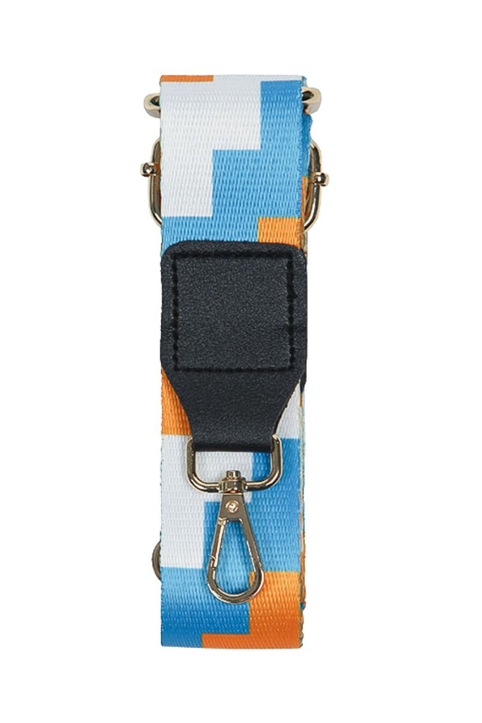 An adjustable mustard and light blue geometric print bag strap. Finished with PU leather tabs and gold hardware.