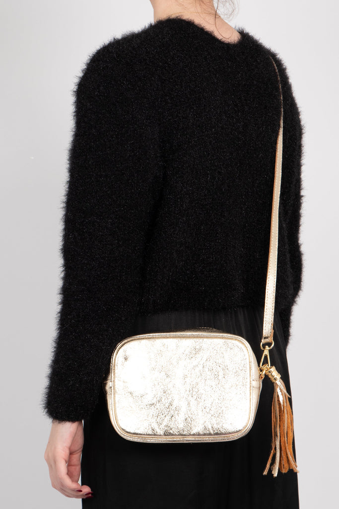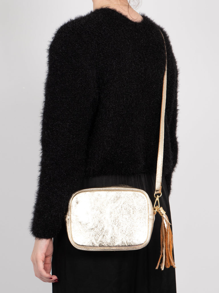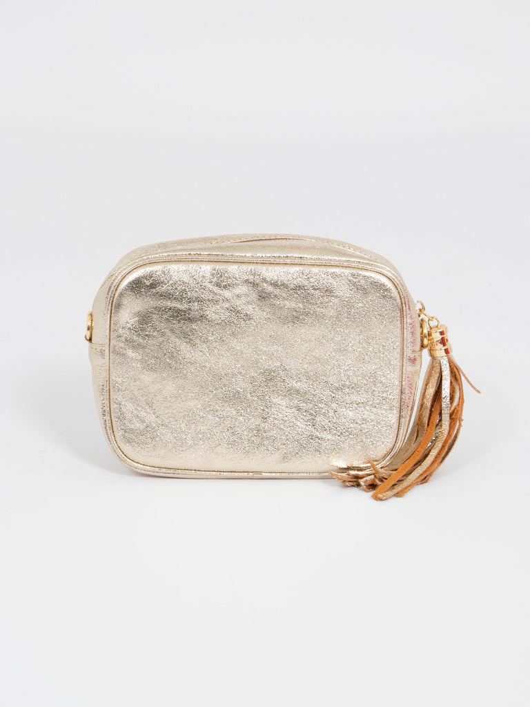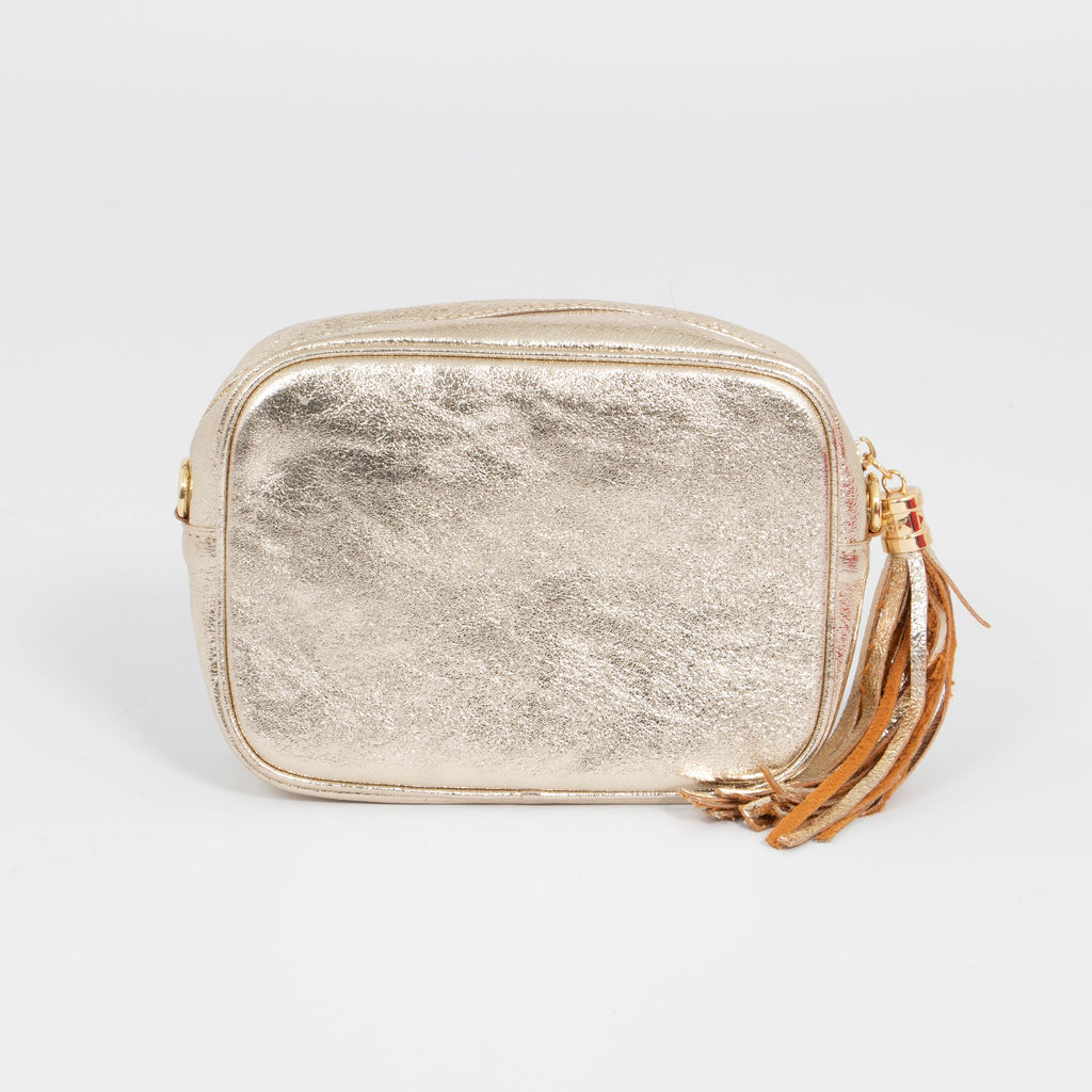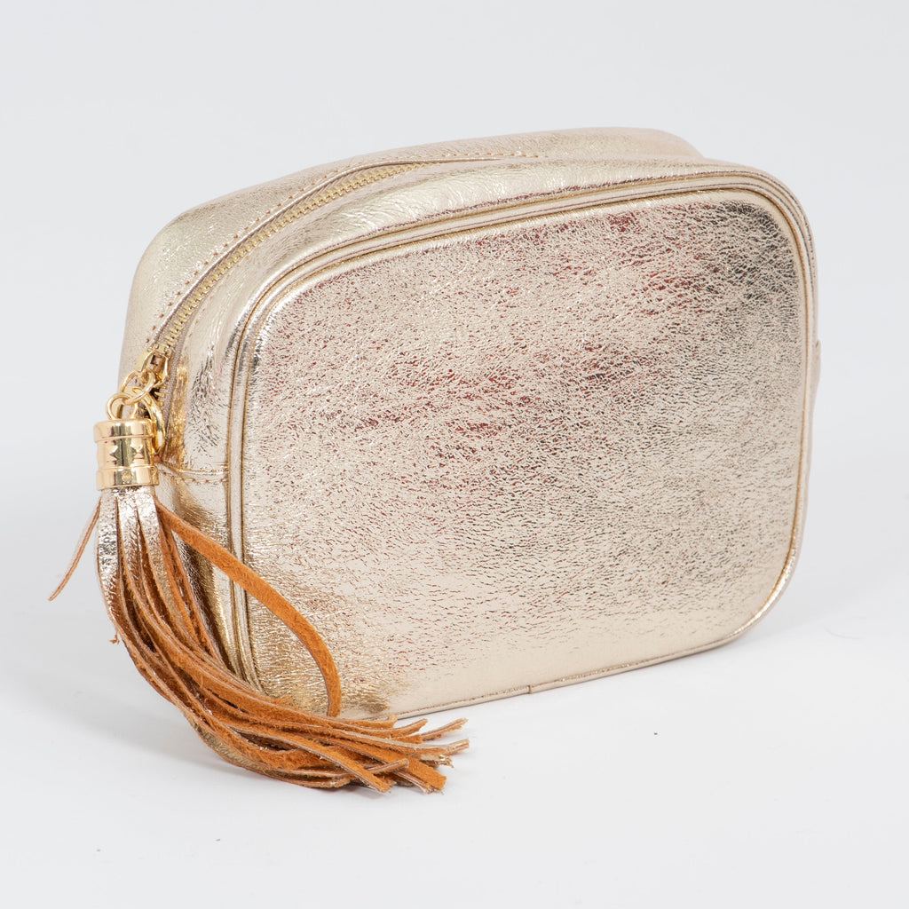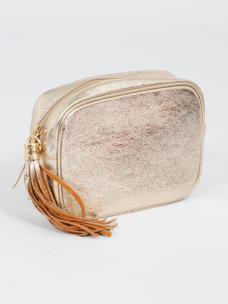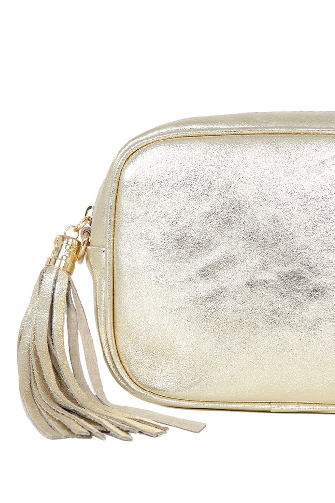This gold metallic crossbody bag is crafted from genuine Italian leather. Featuring a decorative tassel, lined interior, zip closure and classic gold hardware. This luxurious bag includes a removable adjustable strap to wear it over the shoulder or carry cross-body.