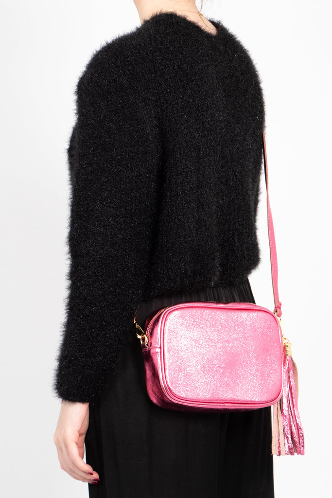 This metallic hot pink crossbody bag is crafted from genuine Italian leather. Featuring a decorative tassel, lined interior, zip closure and classic gold hardware. This luxurious bag includes a removable adjustable strap allowing it to be worn over the shoulder or carried cross body.