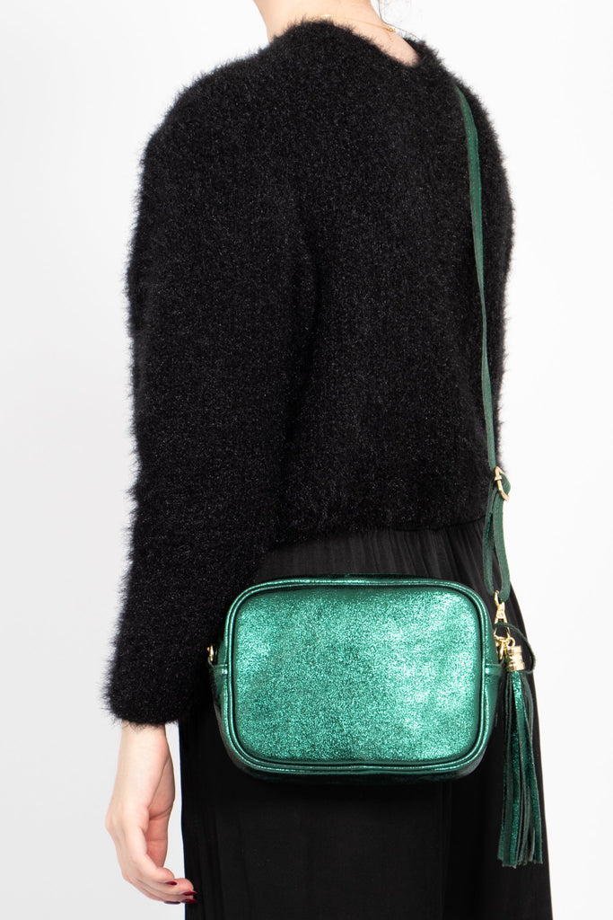 This metallic teal blue crossbody bag is crafted from genuine Italian leather. Featuring a decorative tassel, lined interior, zip closure and classic gold hardware. This luxurious bag includes a removable adjustable strap allowing it to be worn over the shoulder or carried cross body.