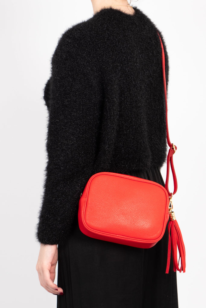 This red crossbody bag is crafted from genuine Italian leather. Featuring a decorative tassel, lined interior, zip closure and classic gold hardware. This luxurious bag includes a removable adjustable strap to wear over the shoulder or carry cross-body.