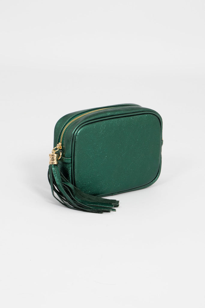 This metallic green crossbody bag is crafted from genuine Italian leather. Featuring a decorative tassel, lined interior, zip closure and classic gold hardware. This luxurious bag includes a removable adjustable strap allowing it to be worn over the shoulder or carried cross body.