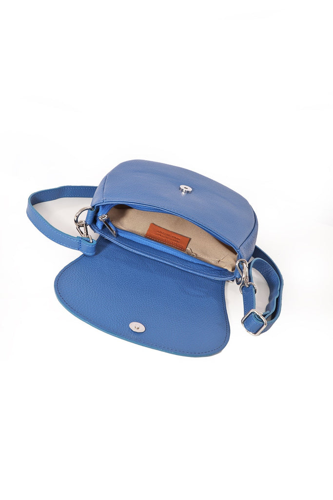Our royal blue pebbled leather crescent-shaped crossbody bag features a convenient back zip pocket, and crossbody strap and is finished with gold hardware. Featuring a lined interior, zip closure and classic gold hardware. This luxurious bag includes a removable adjustable strap allowing it to be worn over the shoulder or carried crossbody.