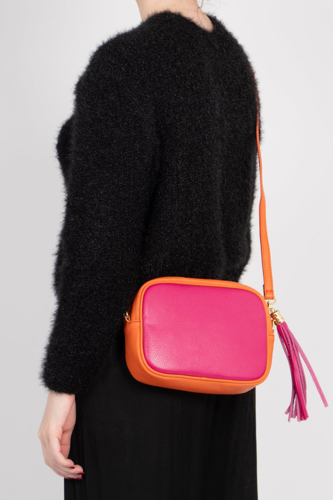 This two tone fuchsia pink and orange crossbody bag is crafted from genuine Italian leather. Featuring a decorative tassel, lined interior, zip closure and classic gold hardware. This luxurious bag includes a removable adjustable strap allowing it to be worn over the shoulder or carried cross body.