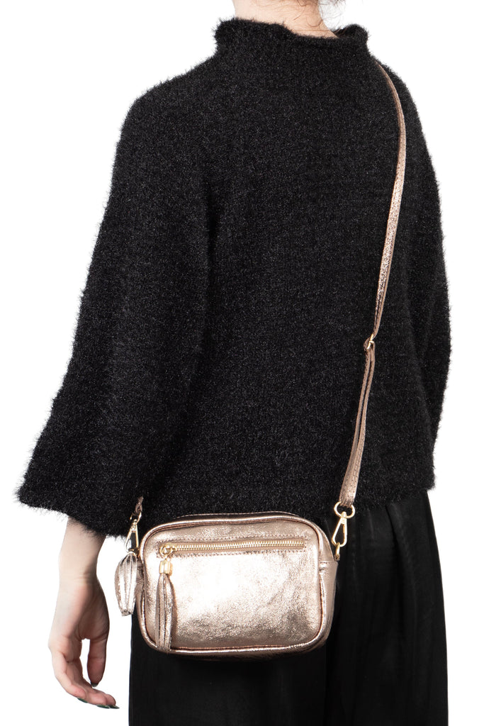 This compact classic crossbody bag is crafted from genuine Italian pebbled leather. Featuring decorative tassels and pockets for storage, this easy to wear bag is the go to everyday accessory.