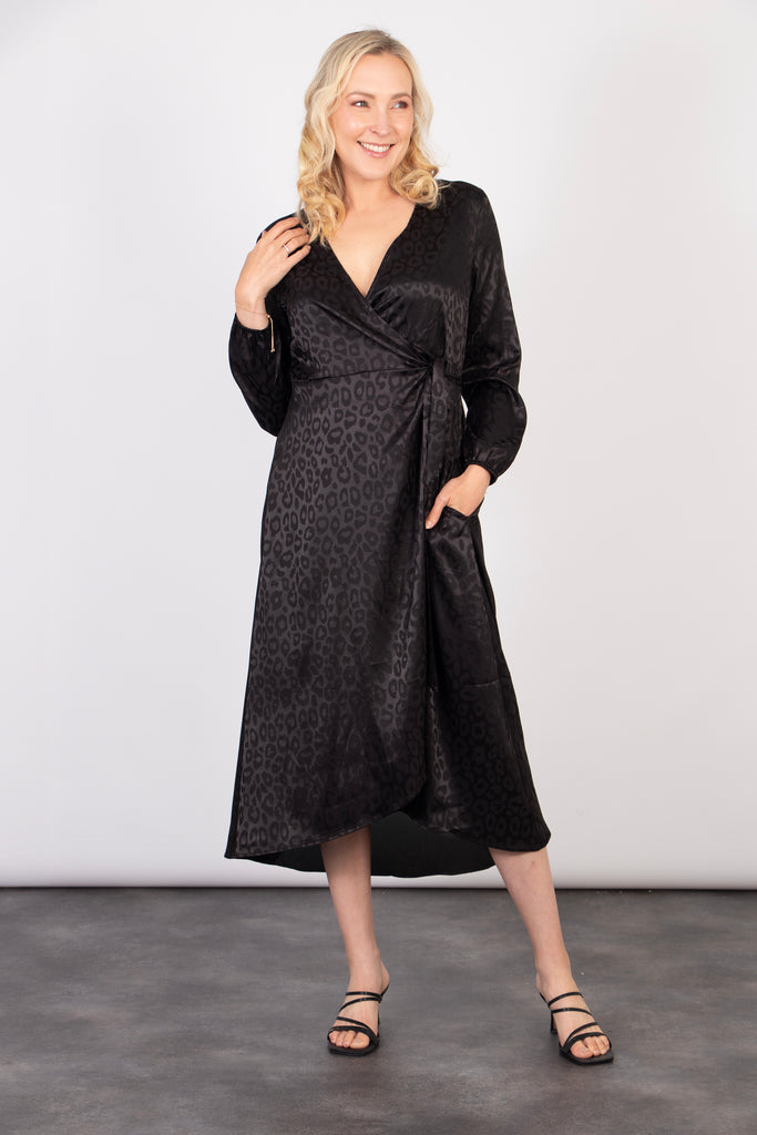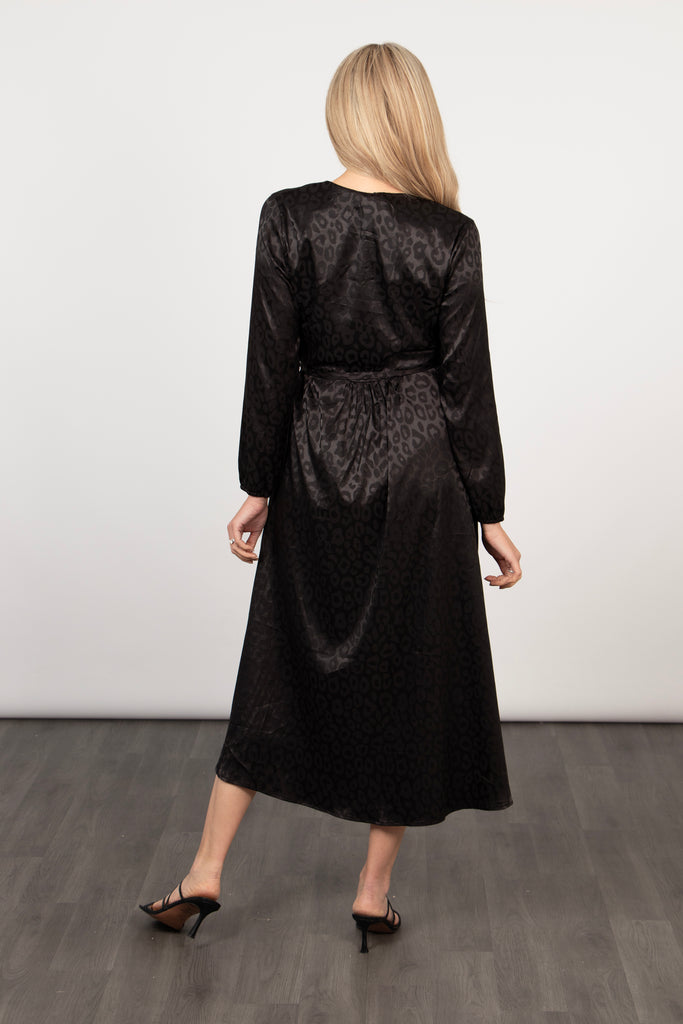 Parker Long Sleeve Midi Wrap Dress - Black, Leopard Print