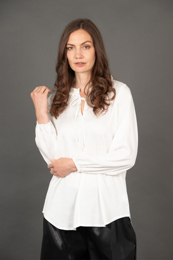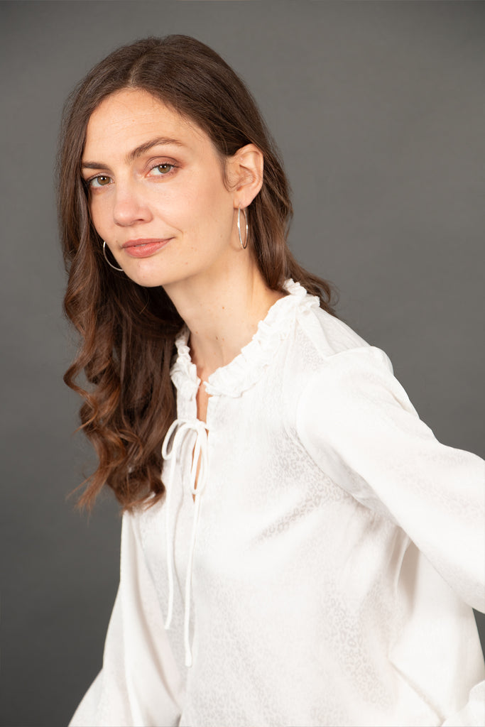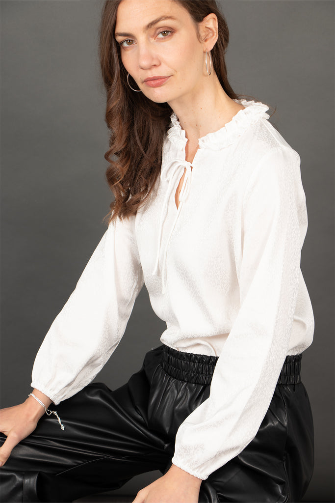 Crafted from soft viscose, this relaxed fitting grandad collar blouse showcases a subtle white leopard print. Silky to the touch and finished with a dipped hem and a subtle V-neck with a ruffled grandad collar.