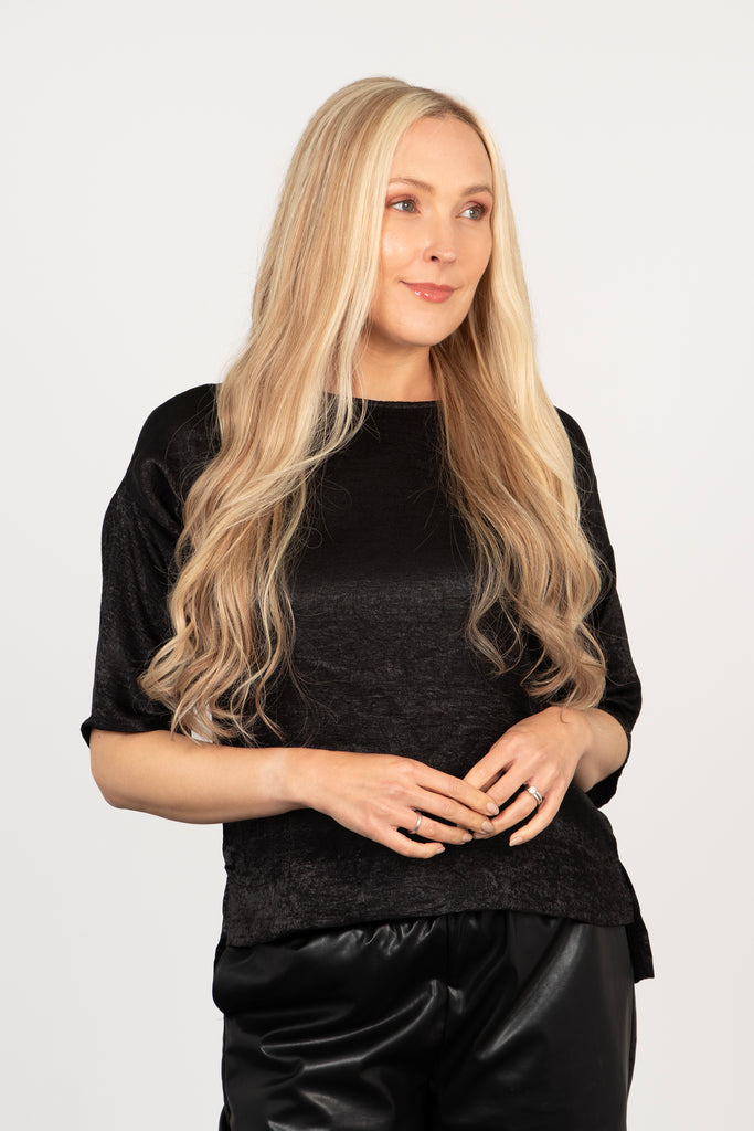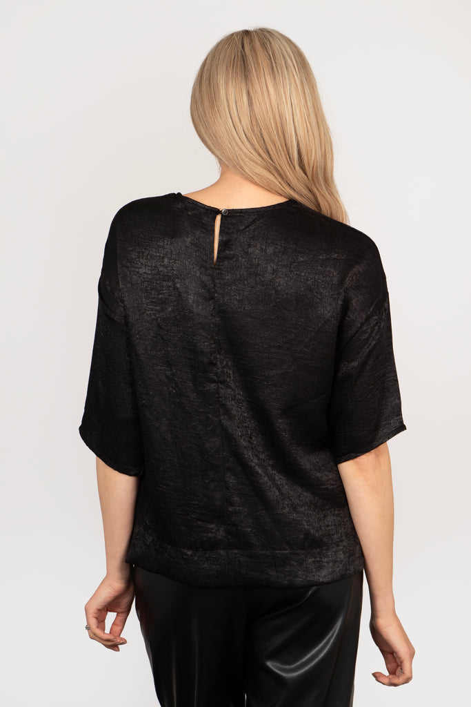 A relaxed fitting black box top crafted from a soft metallic viscose. Showcasing a shiny appearance, drop shoulder and 3/4 sleeves. Pair with your favourite jeans or our Lena wide leg trousers.