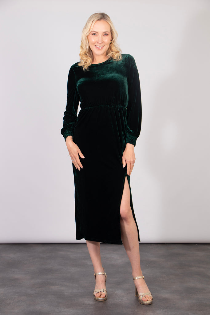 A timeless green midi dress crafted from soft velvet fabric. Showcasing, a chic front split, round neck, long sleeves and a cinched shirred waist. This dress is a perfect occasion piece designed to create a flattering silhouette,