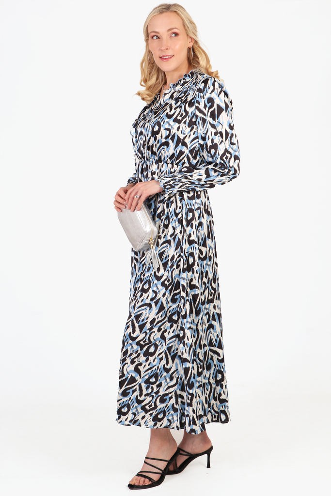 This versatile blue abstract print shirred shoulder midi dress features long sleeves with shirred cuffs and a v-neck with tie detail.