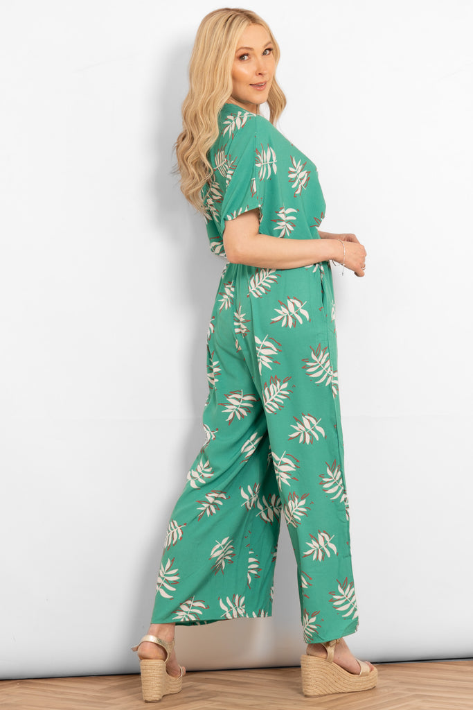 Jilly Deep V Jumpsuit - Green, Palm Leaf