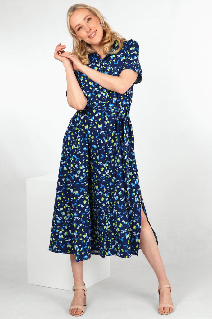 - Abstract Print Short Sleeve Maxi Shirt Dress in Navy Blue
