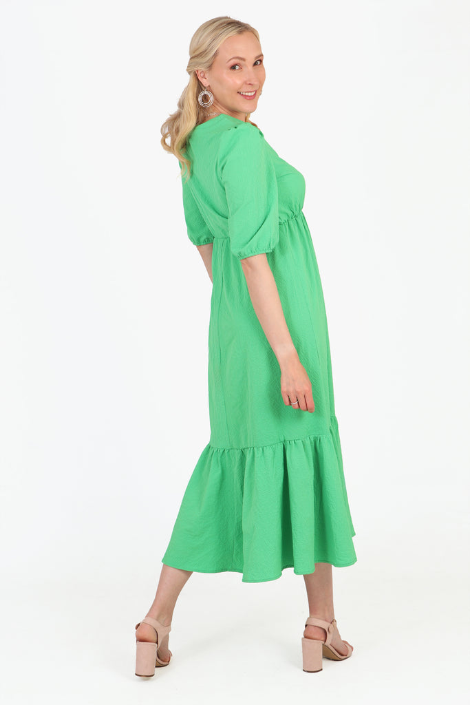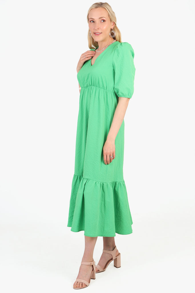 A textured v-neck tiered maxi dress with an elasticated waist and puff sleeves.