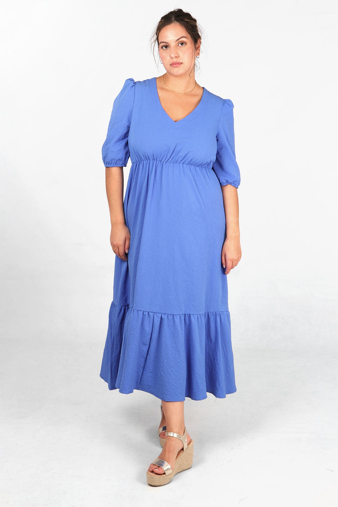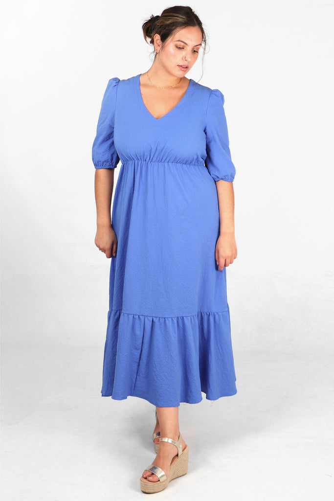 A textured V-neck tiered maxi dress with an elasticated waist and puff sleeves.