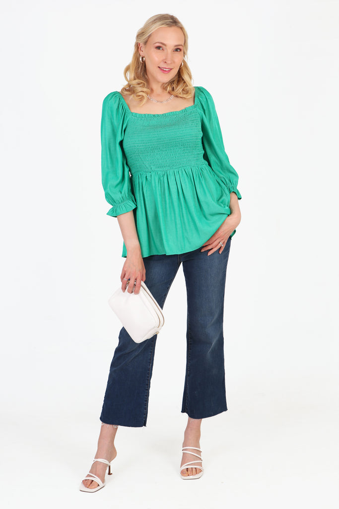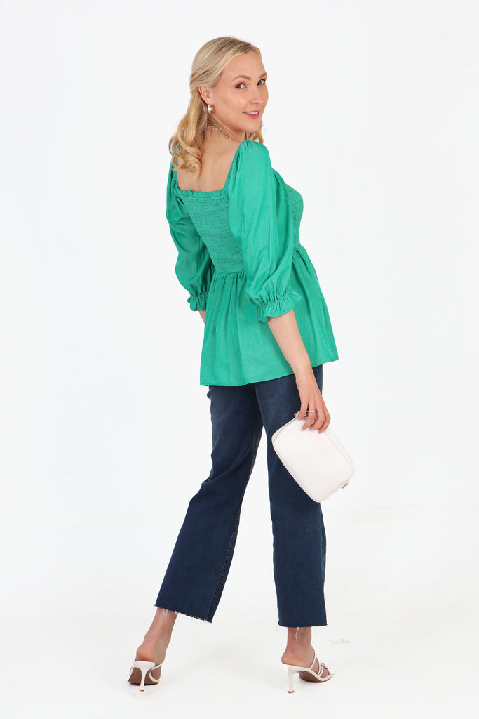 A versatile green milkmaid top featuring a fully shirred bodice, a flattering peplum design and with mid length sleeves.