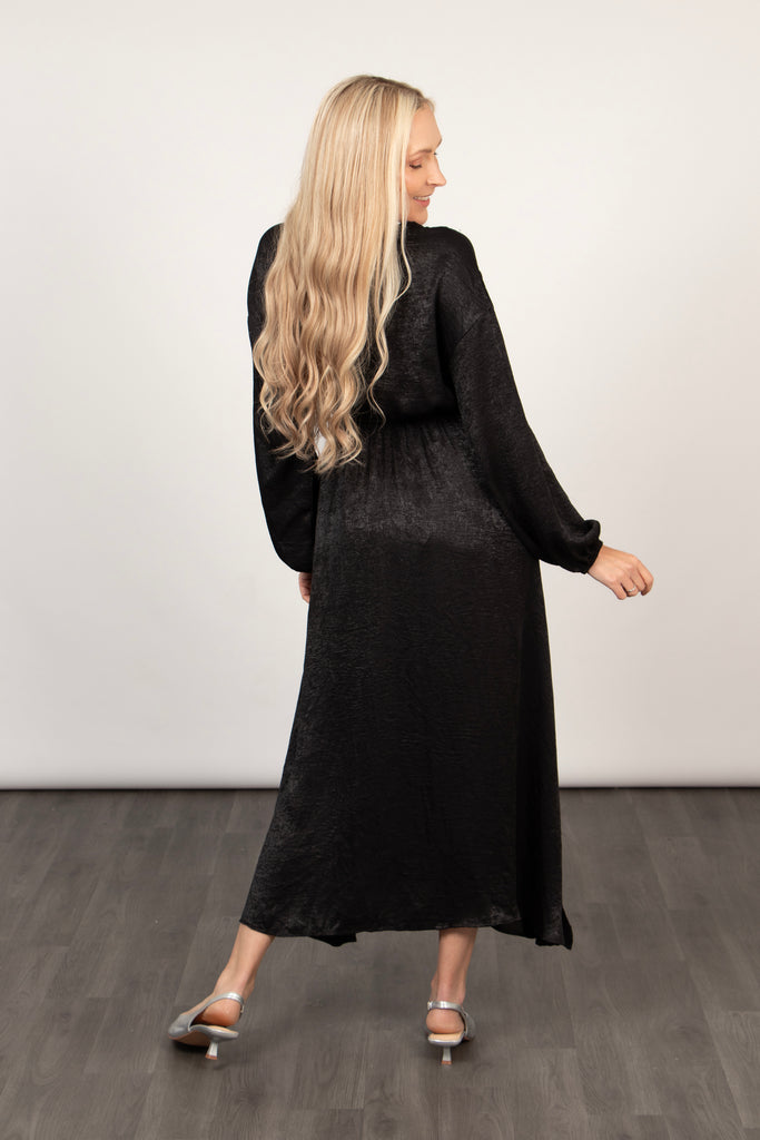 A classic black maxi dress crafted from soft flowing metallic viscose. Showcasing a flattering wrap top, V-neck and empire waist line. This dress is a perfect occasion piece designed to create a flawless silhouette.