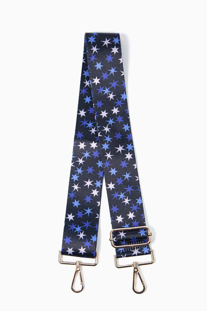 In blue tones, this eye-catching accessory features a multi-star print, adjustable length and gold hardware.