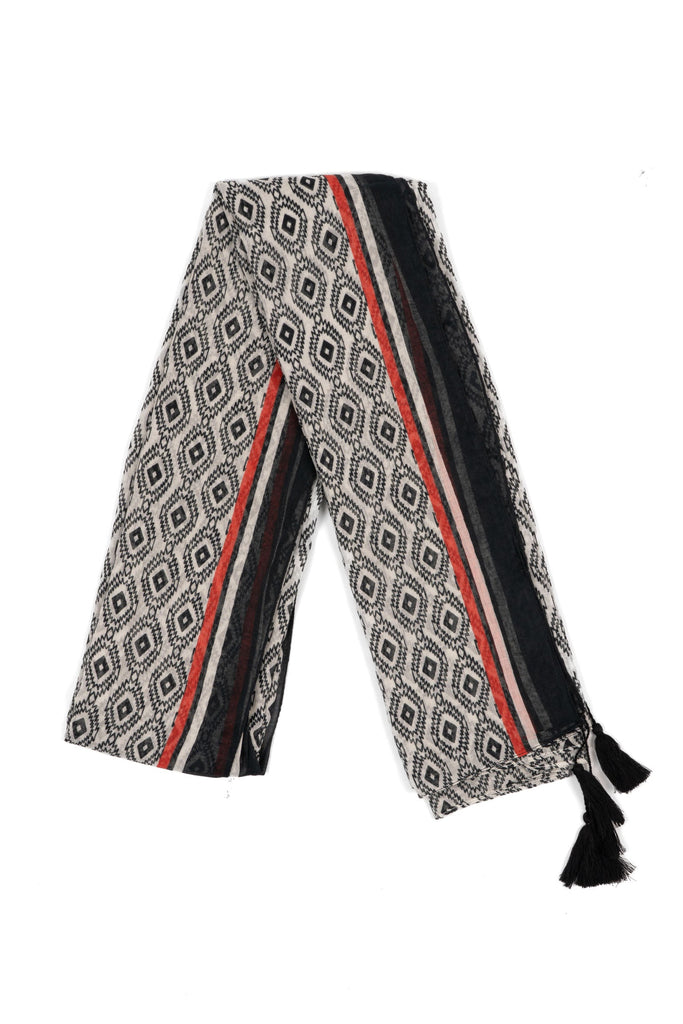 A lightweight mosaic print scarf featuring a contrasting red border trim. Crafted from soft, breathable cotton, this versatile scarf can also be worn as a summer beach cover-up, shawl, or sarong.
