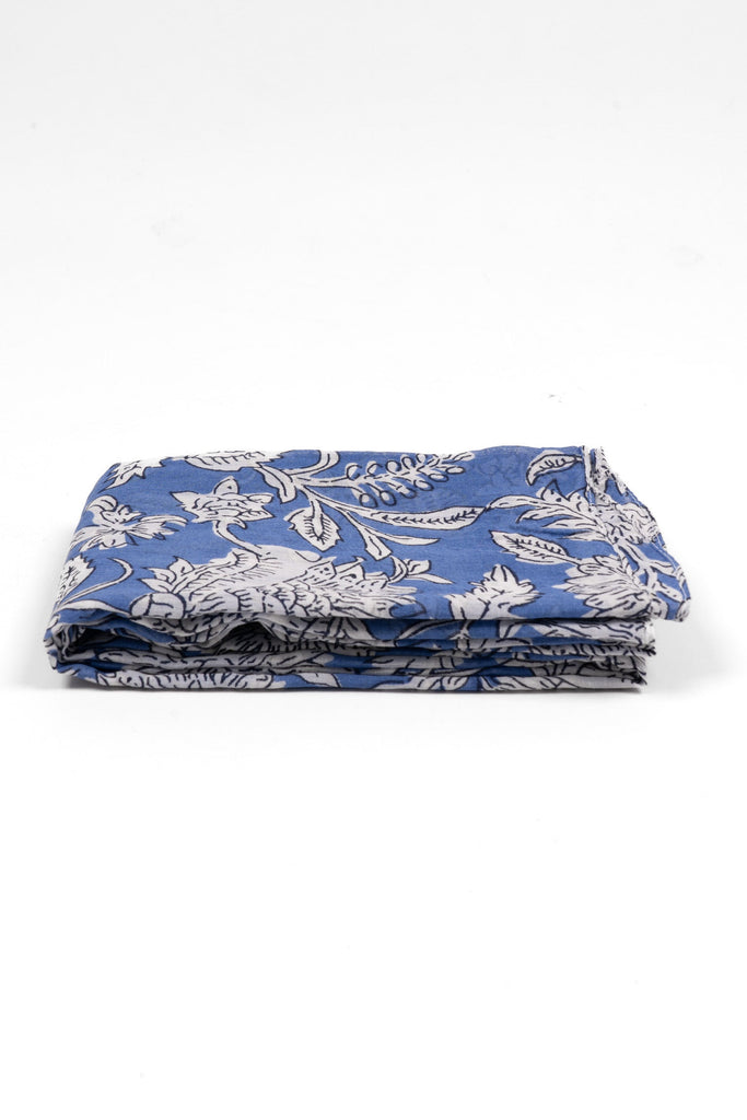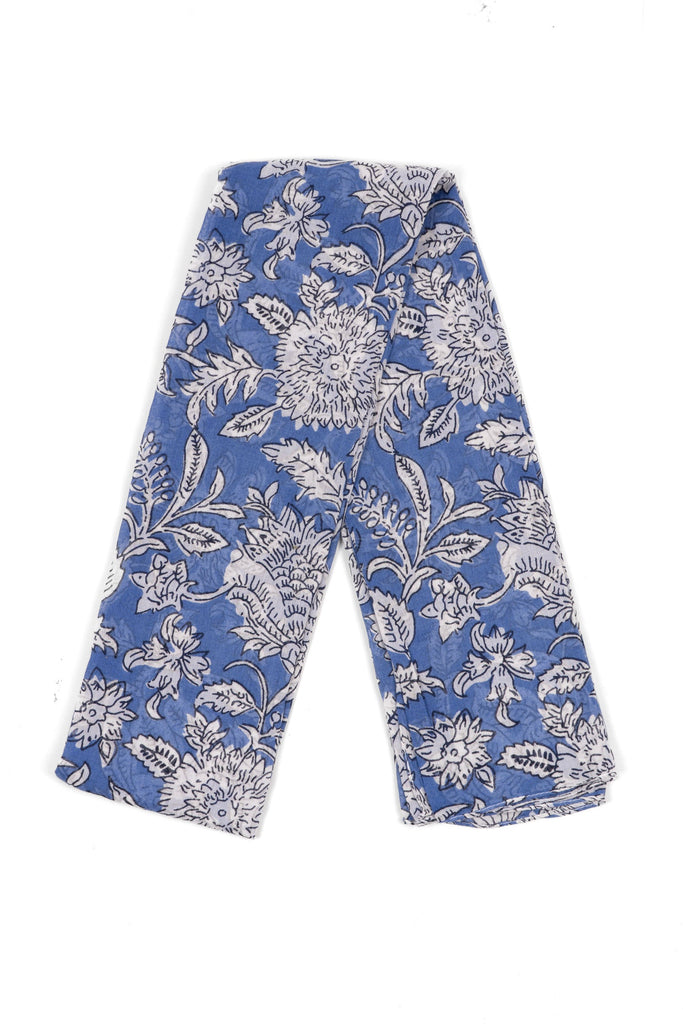 A lightweight blue scarf featuring a vintage Paisley floral pattern. Crafted from soft, breathable cotton, this summery scarf can also be worn as a beach cover-up, shawl, or sarong.