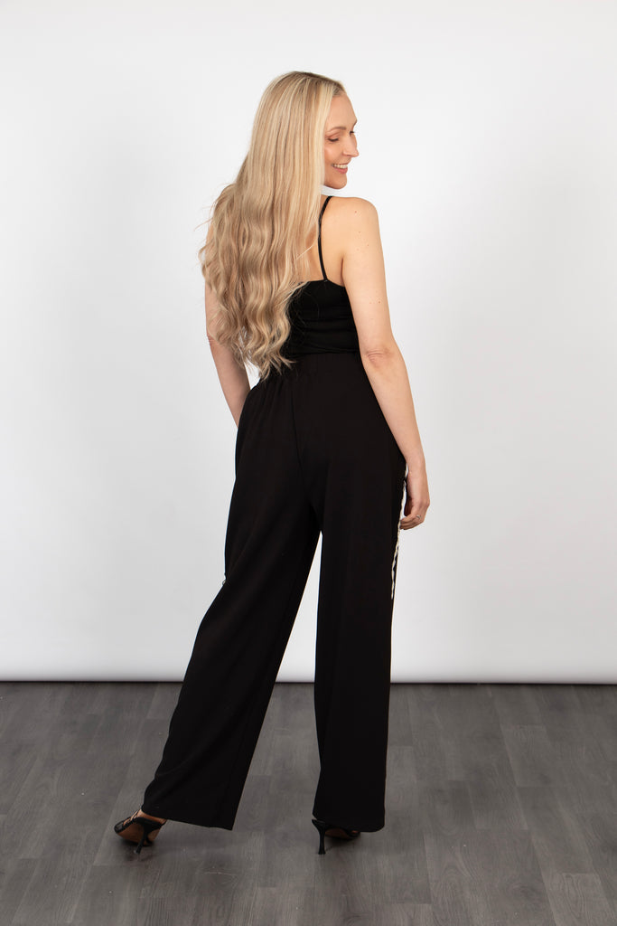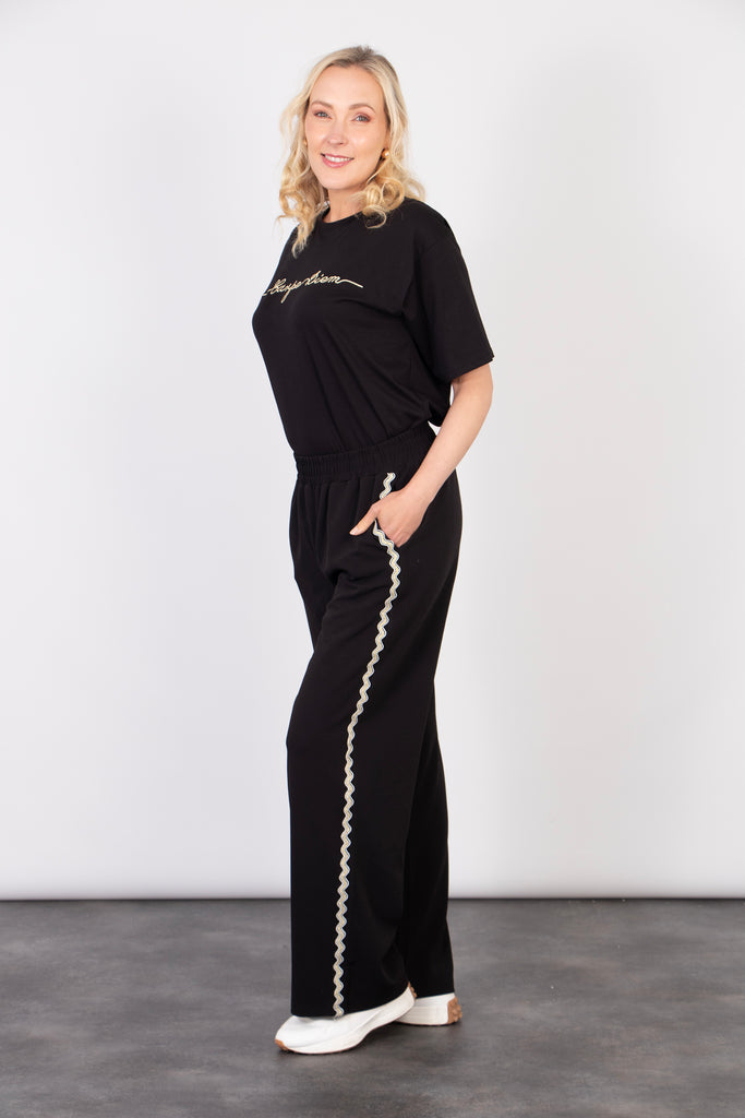 Crafted from a soft viscose blend, these casual trousers are designed for comfort. A classic black wide leg trouser showcasing a wavy gold glitter stripe, elasticated waist and pockets.