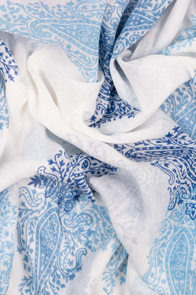A bohemian inspired lightweight scarf featuring an intricate floral pattern. Crafted from soft, breathable cotton, this summery tasselled scarf can also be worn as a summer beach cover-up, shawl, or sarong.